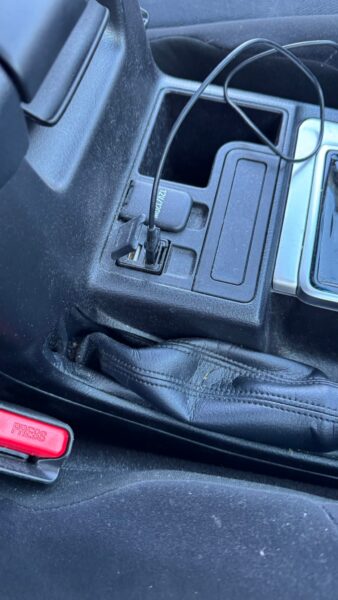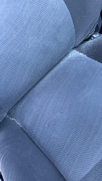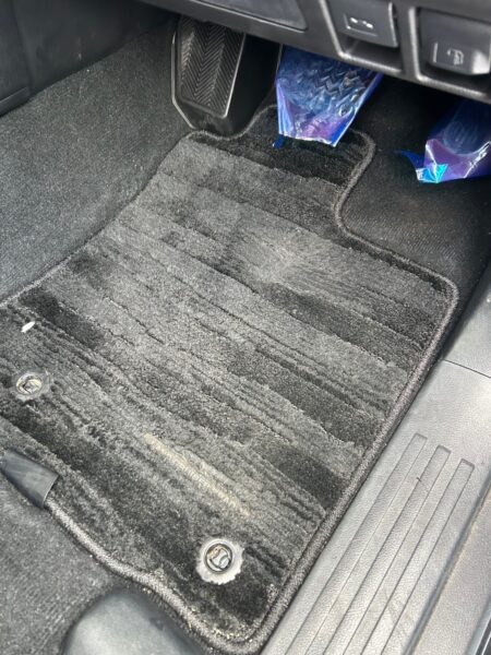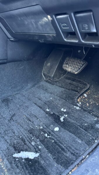 こぼした部分は拭き取ったようですがベタベタしており、車内にかなり強い臭いがしていました。