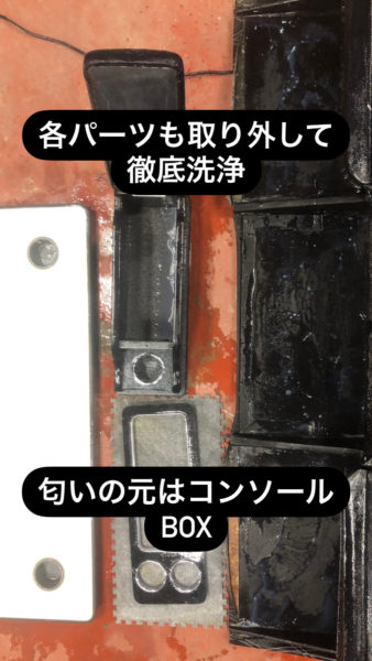 コンソールボックス内はかなり消臭効果の高いケミカル洗浄を行ってもなかなか取れません。